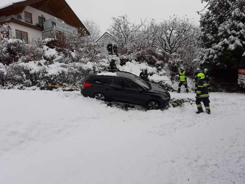 Auf der Schneefahrbahn rutschte ein Lenker mit seinem Pkw über den Straßenrand hinaus und drohte über eine Böschung abzurutschen bzw. umzukippen.